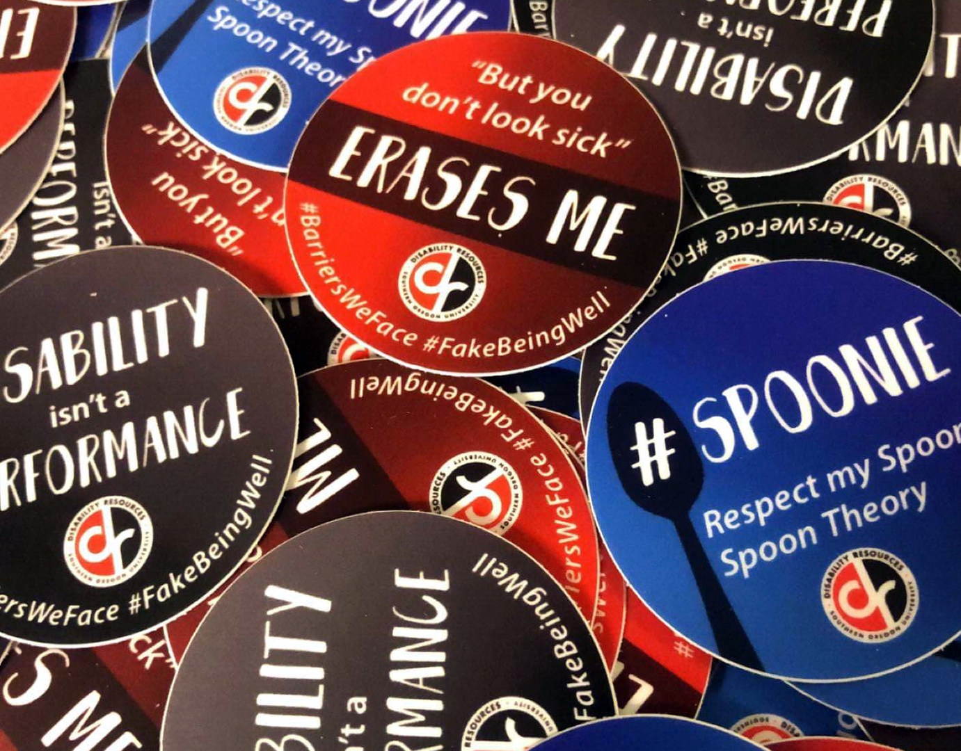 Disability Identity stickers and buttons made for Southern Oregon University Campus Community